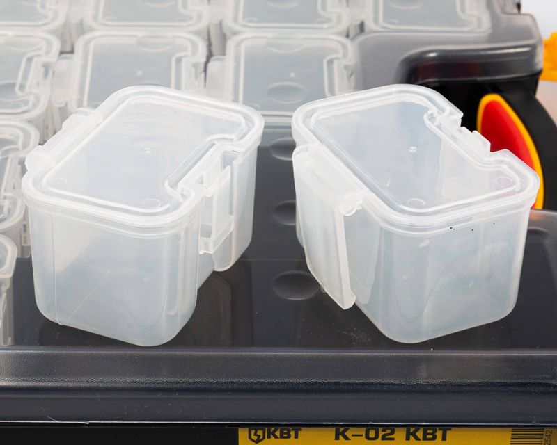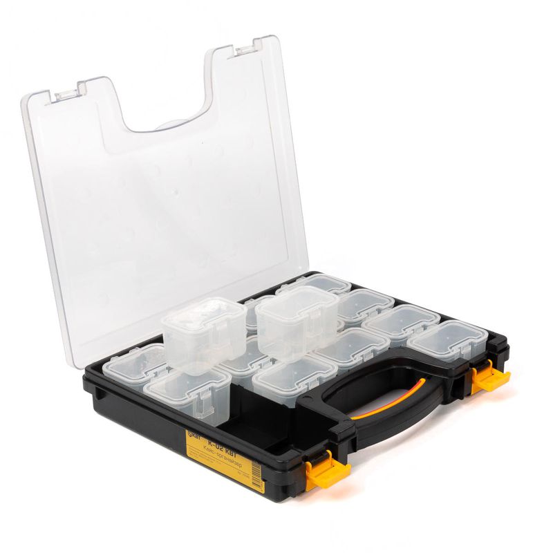 • Пластиковый кейс-органайзер со сменными модулями для хранения мелких деталей • В комплекте: • пластиковый кейс • 14 одинарных модулей 88х60х55 мм • Каждый модуль находится в кейсе в своем отделе • По необходимости, с помощью клипсы можно закрепить модули на поясном ремне • Прозрачные модули позволяют легко идентифицировать их содержимое как в открытом, так и в закрытом кейсе • Прочная защелка на крышке каждого модуля • Возможность установки модулей в кейсе в произвольном порядке • Крышка кейса открывается на 90° • Прозрачная крышка кейса позволяет с легкостью находить нужный модуль • Надежные замки для фиксации крышки кейса • Прочная рукоятка со вставкой из мягкой нескользящей резины для переноски кейса • Ножки для установки кейса в вертикальном положении • Габариты кейса: 380х310х65 мм • Вес: 1.30 кг