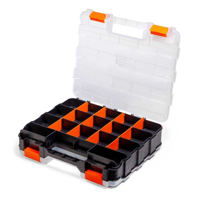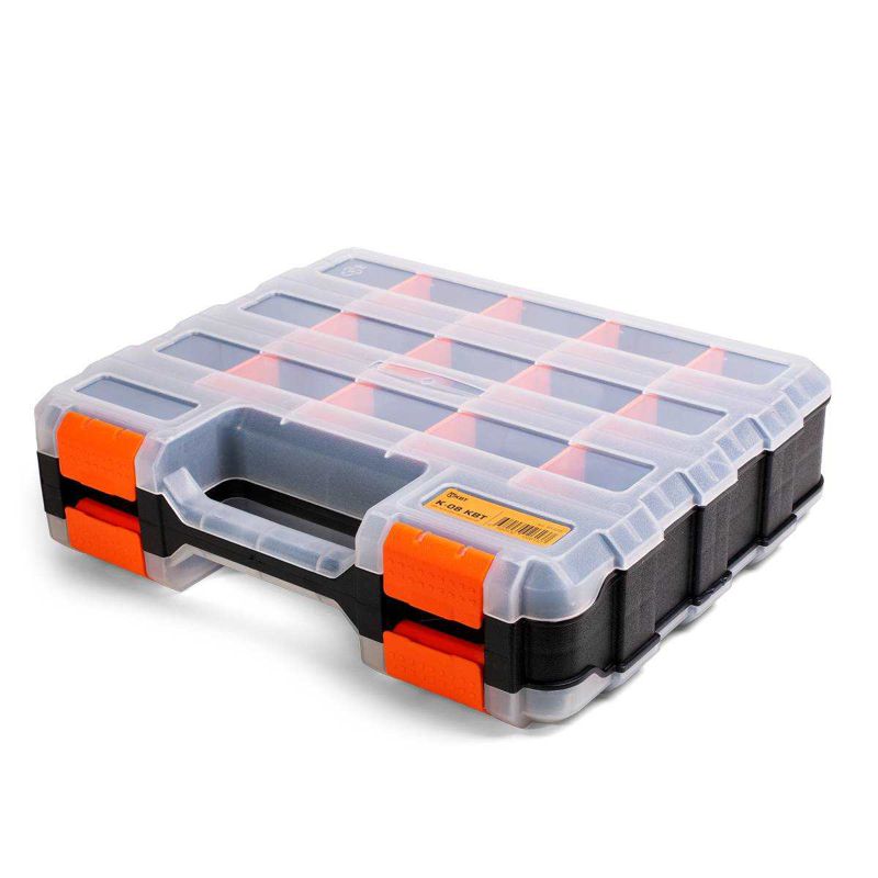 • Пластиковый двухсторонний кейс-органайзер с модульными отделениями для хранения мелких предметов • В комплекте: • пластиковый кейс • 24 разделительные пластины • Размеры основных отделений с каждой из сторон: • 62х300 мм – 3 шт. • 85х42 мм – 2 шт. • При помощи разделительных пластин из каждого большого отделения можно сделать 5 • Крышка кейса открывается на 180° • Прозрачная крышка кейса позволяет с легкостью идентифицировать содержимое • Плотное прилегание крышки исключает пересыпание содержимого из отсека в отсек • Надежные замки из ABS-пластика для фиксации крышки кейса • Прочная рукоятка для переноски кейса • Ножки для установки кейса в вертикальном положении • Симметричная внутренняя конструкция каждой стороны кейса • Габариты кейса: 320х270х80 мм • Вес: 0.94 кг