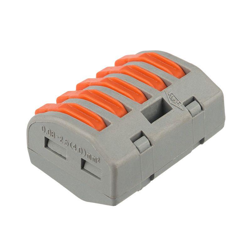 Соединительная многоразовая клемма REXANT на 5 проводников с плоско-пружинным зажимом предназначена для подсоединения медных одножильных и многожильных зачищенных проводников тонкого сечения. Перед монтажом с соединяемых проводников необходимо снять изоляцию в соответствии с обозначениями на корпусе клеммы (9-12 мм). Зачищенный участок с монтажной стороны не должен иметь сильных изгибов. Вставьте его в свободное гнездо клеммы, предварительно подняв оранжевый рычажок, после этого опустите рычажок в исходное положение. Контакт осуществляется путем зажима проводника пластиной. Конструкция предотвращает случайное размыкание контакта. Специальное технологическое отверстие на корпусе клеммы предназначено для проверки соединения тестером-пробником или щупом мультиметра. Корпус из пластика делает контакт изолированным. Извлечение проводника (демонтаж) осуществляется действиями в обратном порядке. Характеристики: Размер: 26,6x14.5x20.5 мм Материал: Полиамид 66 Количество контактов: 5 Материал контактов: луженая медь Зажим: сталь Цвет: серый Напряжение: 400 В Материал подключаемых проводов: Cu Типы подключаемых проводов: одножильные, многожильные Ток: для одножильных проводов — 32 А, для многожильных проводов — 24 А\28-12 AWG Поддерживаемое сечение: 5x0.2-4 мм2 (одножильный провод), 5x0.14-2.5 мм2 (многожильный провод) Рабочая температура: –40...+85 ?C