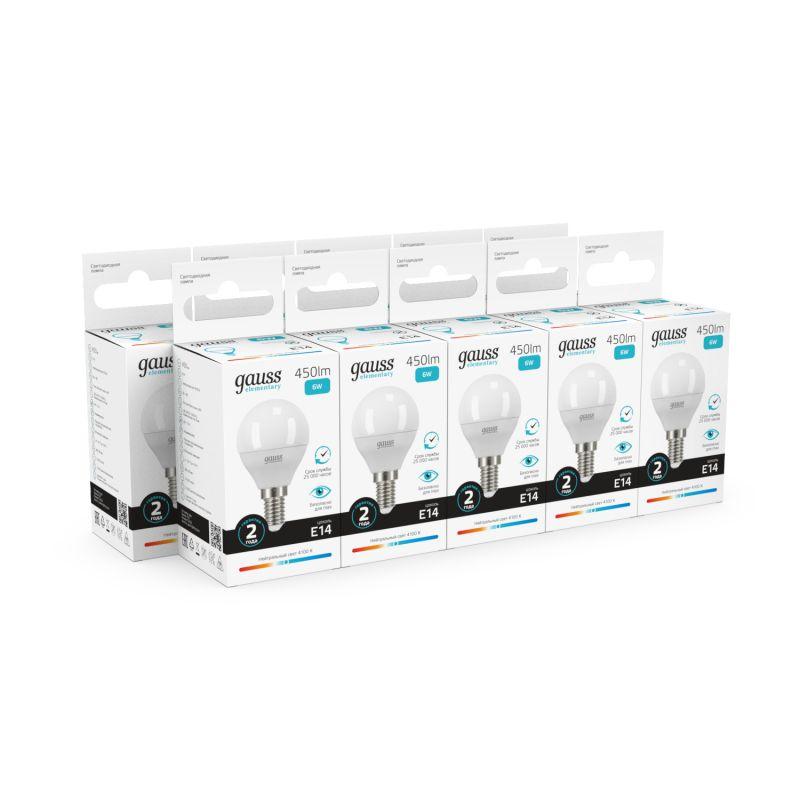 Лампа светодиодная LED Elementary Globe 6Вт E14 4100К Gauss 53126 – лампа с колбой вида "шар", белого света, длиной 87 мм, диаметром 45 мм, с цоколем Е14, мощностью 6 Вт. Цветовая температура 4100 К.