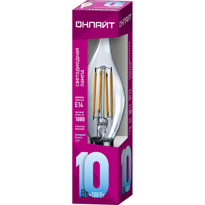 Лампа светодиодная филаментная 80 899 OLL-F-FC35-10-230-4K-E14 10Вт свеча на ветру прозрачная 4000К нейтр. бел. E14 1000лм 220-240В ОНЛАЙТ 80899