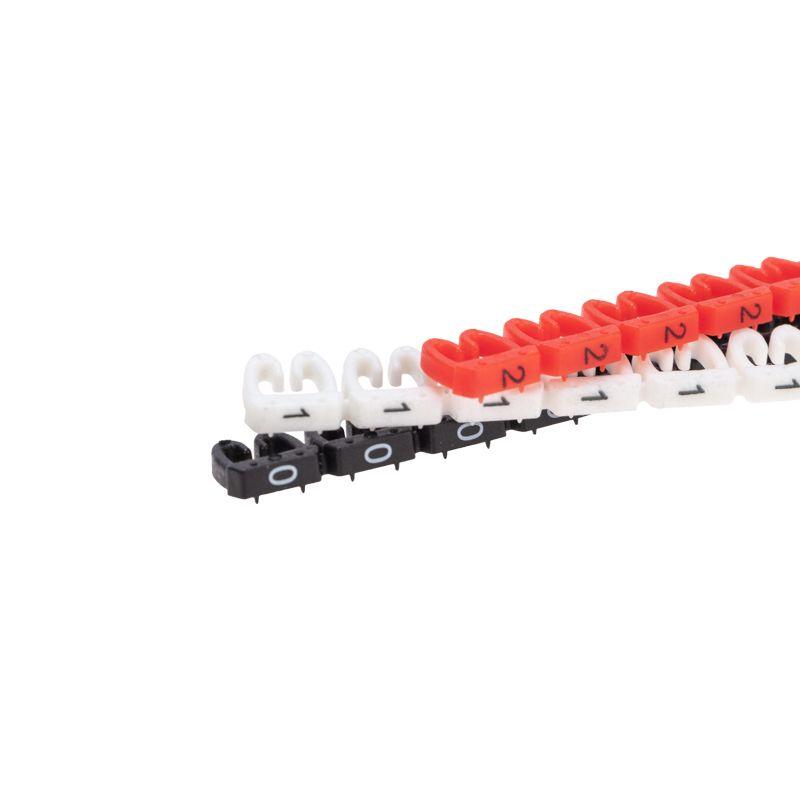 Маркеры с цифрами от 0 до 9 предназначены для маркировки проводов и кабелей в распределительных щитах. Облегчают идентификацию проводов в процессе монтажа и демонтажа проводки, помогают определить группу кабелей и источников при обслуживании и диагностике. Маркеры изготавливаются из эластичного и негорючего поливинилхлорида. Рабочая температура не должна превышать 85 °C. Благодаря специальной эластичной форме каждый маркер надежно фиксируется на проводах с сечением от 4 до 6 мм. Предусмотрено отверстие для проводника. Каждая цифра имеет свой цвет: черный, красный, оранжевый, желтый, зеленый, синий, фиолетовый, серый, белый, розовый. Маркеры соединяются между собой с помощью зубцов и пазов.