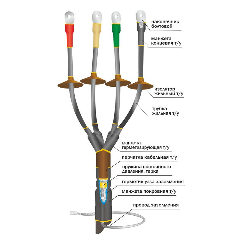 Муфта кабельная концевая марки 1КНТпН-4х(70-120) с болтовыми наконечниками наружной установки предназначена для оконцевания 4-х жильных силовых кабелей сечением 70, 95, 120 кв.мм с бумажной или пластмассовой изоляцией, с броней или без брони, на напряжение до 1 кВ включительно. Устанавливается на открытом воздухе. Эксплуатируется при температуре окружающей среды от -50°C до +50°C и относительной влажности до 98%. Соответствует требованиям ГОСТ 34839-2022 и ТУ 3599-012-31930690-2016. Прошла необходимый комплекс независимых испытаний в аккредитованных лабораториях, на основании которых выданы сертификаты соответствия требованиям ГОСТ, ТУ, пожарной и экологической безопасности. Монтируется на разделке кабеля путем термоусаживания деталей из модифицированного полимера с помощью газовой горелки или высокотемпературного фена. Универсальные болтовые наконечники со срывными головками, входящие в комплект кабельной муфты, подходят для кабелей как с алюминиевыми, так и с медными жилами. Комбинированный комплект заземления предусматривает крепление провода заземления к металлической оболочке кабеля с применением роликовой пружины постоянного давления и контактной терки, а к бронелентам - методом пайки. Обладает устойчивостью к ультрафиолетовому излучению и воздействию погодно-климатических факторов. Сочетает простоту монтажа и высокую эксплуатационную надежность. Срок службы - не менее 30 лет.