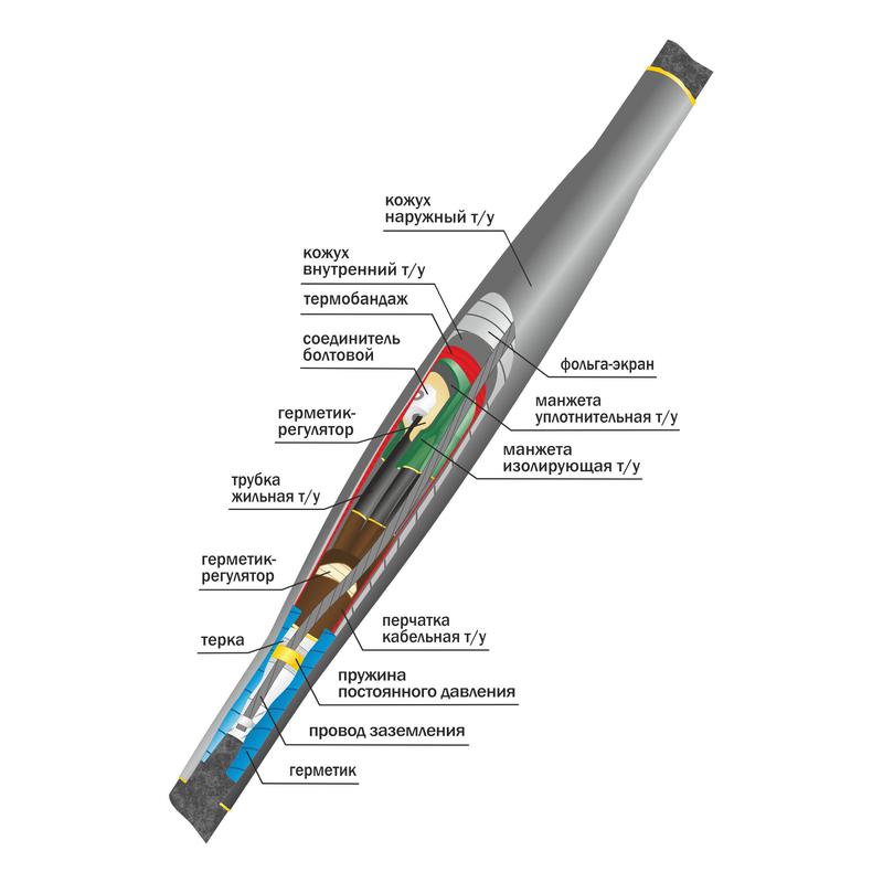 Муфта кабельная соединительная марки 10СТп(тк)-3х(35-50) с болтовыми соединителями предназначена для соединения 3-х жильных силовых кабелей сечением 35, 50 кв.мм с бумажной пропитанной изоляцией, с броней или без брони, на напряжение до 10 кВ включительно. Устанавливается непосредственно в грунте, а также в тоннелях, каналах, коллекторах и других кабельных сооружениях без ограничения по уровню прокладки. Эксплуатируется при температуре окружающей среды от -50°C до +50°C и относительной влажности до 98%. Соответствует требованиям ГОСТ 34839-2022 и ТУ 3599-012-31930690-2016. Прошла комплекс независимых испытаний в аккредитованных лабораториях, на основании которых выданы сертификаты соответствия требованиям ГОСТ, ТУ, пожарной и экологической безопасности. Монтируется на двух концах соединяемых кабелей путем термоусаживания деталей из модифицированного полимера с помощью газовой горелки или высокотемпературного фена. Универсальные болтовые соединители со срывными головками, входящие в комплект кабельной муфты, подходят для кабелей как с алюминиевыми, так и с медными жилами. Комбинированный комплект заземления предусматривает крепление провода заземления к металлическим оболочкам соединяемых кабелей с применением роликовых пружин постоянного давления и контактных терок, а к бронелентам - методом пайки. Обладает необходимым уровнем устойчивости к воздействию агрессивных внешних факторов. Сочетает простоту монтажа и высокую эксплуатационную надежность. Срок службы - не менее 30 лет.