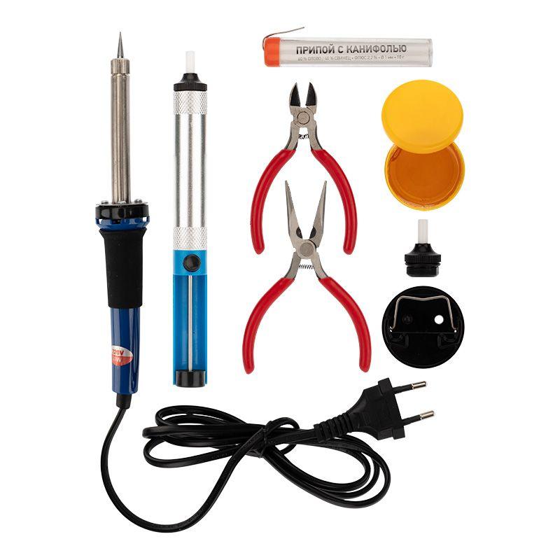 Набор для пайки № 13 (паяльник 30 Вт, подставка, канифоль, припой, бокорезы, тонкогубцы) REXANT позволит эффективно, быстро и самостоятельно отремонтировать электротехнику или произвести монтаж оборудования. Состав набора: 1. Паяльник напряжение 230 В / 50Гц мощность 30 Вт рабочая температура жала: 400 ? разогрев до рабочей температуры: 5 мин установочный диаметр жала: 4.5 мм 2. Подставка под паяльник с хромовым покрытием и термостойким основанием. Не подлежит обязательному подтверждению соответствия. 3. Экстрактор припоя алюминиевый со сменным наконечником. Не подлежит обязательному подтверждению соответствия. 4. Сменный наконечник экстрактора припоя Не подлежит обязательному подтверждению соответствия. 5. Канифоль сосновая Не подлежит обязательному подтверждению соответствия. 6. Припой спиралью в колбе состав: 60 % - олово, 40 % - свинец; диаметр 1 мм; вес 10 г. Не подлежит обязательному подтверждению соответствия. 7. Бокорезы материал рабочей поверхности: хром-ванадиевая сталь твердость на поверхности бокорезов: 38-42 HRC твердость на поверхности режущей кромки: 45-48 HRC способ обработки: закалка длина инструмента: 110 мм материал рукоятки: ПВХ Не подлежит обязательному подтверждению соответствия. 8. Тонкогубцы материал рабочей поверхности: хром-ванадиевая сталь твердость на поверхности тонкогубцев: 38-42 HRC твердость на поверхности режущей кромки: 45-48 HRC способ обработки: закалка длина инструмента: 120 мм материал рукоятки: ПВХ Не подлежит обязательному подтверждению соответствия. Простая конструкция и высококачественное исполнение позволят даже новичку без труда справиться с пайкой различных изделий.