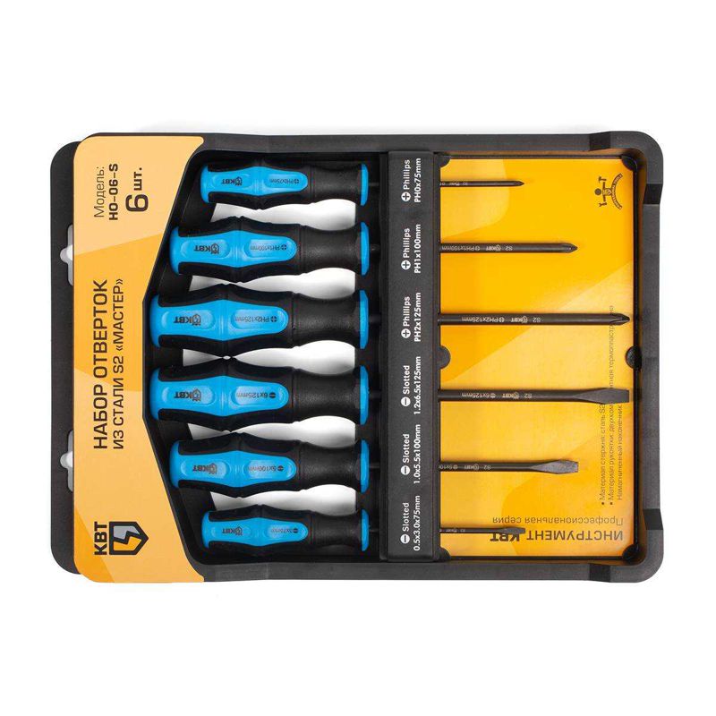 • Состав набора: • отвертка: шлиц 3.0х75 МАСТЕР • отвертка: шлиц 5.0х100 МАСТЕР • отвертка: шлиц 6.0х125 МАСТЕР • отвертка: PH0х75 МАСТЕР • отвертка: PH1х100 МАСТЕР • отвертка: PH2х125 МАСТЕР • Намагниченный вороненый наконечник • Стержни из высококачественной инструментальной легированной стали S2 • Покрытие стержня: черное фосфатирование • Двухкомпонентная рукоятка с мягкими прорезиненными вставками • Маркировка на торце рукояток с обозначением типа профилей • Специальная форма рукоятки, не позволяющая инструменту скатываться с наклонной поверхности • Упаковка: блистер