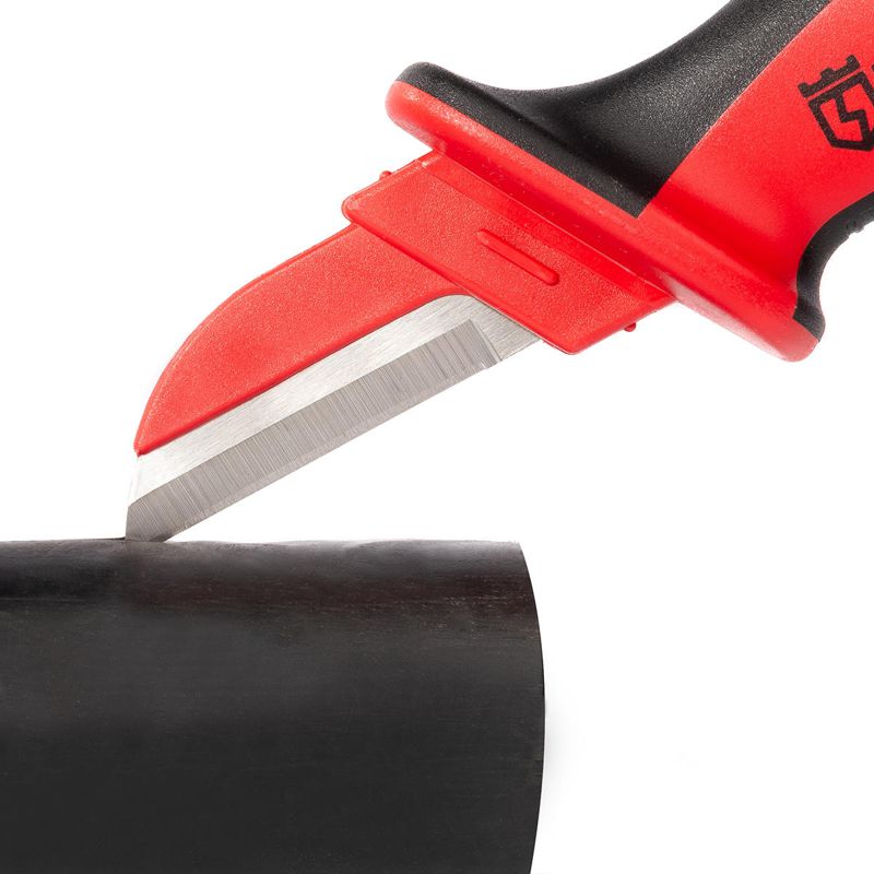 • Для работы под напряжением до 1000 В • Прямое, частично изолированное лезвие для защиты от короткого замыкания • Лезвие из японской нержавеющей стали • Твердость лезвия HRC 51...53 • Изолированная рукоятка с упором для пальцев • Двухкомпонентная рукоятка из нескользящей термопластрезины • Защитный чехол для безопасного хранения и транспортировки • Зачистка жил от окисной пленки, снятие оболочкии изоляции кабеля • Вес: 110 г • Длина: 195 мм