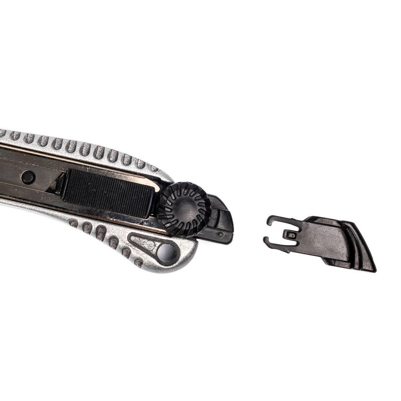 • Предназначен для резки тонких строительных материалов (бумага, картон, пластик, резина и т.д.) • Выдвижное секционное лезвие • Ширина лезвия: 18мм • Материал лезвий: инструментальная сталь • Трещоточный фиксатор лезвия • Механизм автовозврата лезвия • Никелированные направляющие из нержавеющей стали • Эргономичный корпус из легкого сплава с нескользящими вставками • Корпус оснащен отверстием для подвешивания • Вес: 108г • Длина: 200мм