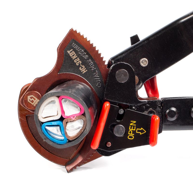 • Диапазон резки: кабели с ленточной броней ? до 32 мм • Специальная термообработка лезвий • Твердость лезвий HRC 48...52 • Усовершенствованная конструкция • Надежный храповой механизм • Возможность работы одной рукой • Функция разблокировки лезвий из любого положения • Блокиратор рукояток • Не предназначены для резки стальных тросов • Вес: 600 г • Длина: 250 мм