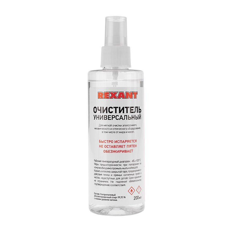 Очиститель универсальный 200 мл (с распылителем) REXANT предназначен для «мягкой» очистки или обезжиривания различных предметов. Применяется для очистки радиоэлектронных элементов (печатные платы, контакты реле и прочие), очистки оптического оборудования (линзы стекла, объективы), бытовых нужд (чистка зеркал, оконных стекол, хрусталя; как жидкое топливо в спиртовках и зажигалках; растопка древесного угля), в автомобильном деле (очистка и удаление влаги из бензобака автомобиля, антизамораживатель стеклоомывающей жидкости при минусовых температурах), при монтаже и обслуживании волоконно-оптических кабелей (ВОЛС), обслуживания аудио– и видеооборудования и других целей. Представляет собой бесцветную прозрачную жидкость без механических примесей с характерным запахом. Очиститель является хорошим растворителем для различных эфирных масел, при промывке высокотехнологичных узлов и агрегатов, как обезжиривающее средство. Он быстро испаряется, не оставляя пятен на металлических или стеклянных поверхностях. Для быстрого и удобного нанесения флакон оборудован распылителем. Основные характеристики: Состав: абсолютированный изопропиловый спирт 99,7% Запах: спиртовой Объем: 200 мл