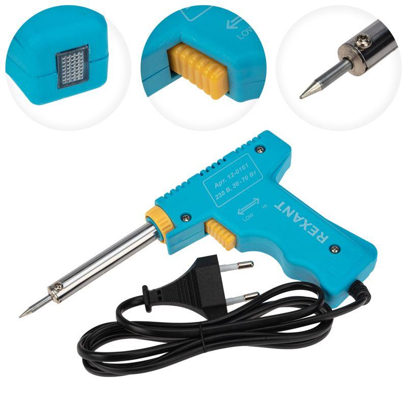Паяльник-пистолет двухрежимный серии МАСТЕР мощностью 30/70Вт REXANT предназначен для ручного монтажа/демонтажа электронных компонентов и других мелких и средних деталей. Конструктивные особенности: рукоятка в форме пистолета, возможность осуществлять пайку в двух режимах мощности (30Вт и 70Вт). Наличие 2-х режимов обеспечивает экономичное энергопотребление. Максимальная мощность и ускоренный разогрев активируются нажатием и удержанием кнопки, расположенной на рукоятке, что позволяет мастеру сначала установить жало инструмента в определенную точку пайки, а затем перевести паяльник в максимальный рабочий режим. Долговечное жало паяльника состоит из медьсодержащего сердечника, покрытого слоем электролитически осажденного железа, отличающегося высокой стойкостью к коррозии. В случае необходимости жало можно легко и быстро заменить (сменное в комплект не входит). На корпусе расположен индикатор включения.