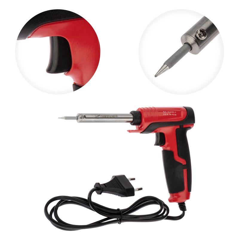 Паяльник-пистолет двухрежимный серии ПРОФИ мощностью 30/70Вт REXANT предназначен для ручного монтажа/демонтажа электронных компонентов и других мелких и средних деталей. Конструктивные особенности: рукоятка в форме пистолета из термостойкого пластика с резиновыми вставками, два режима мощности 30Вт и 70Вт. Наличие 2-х режимов обеспечивает экономичное энергопотребление. Максимальная мощность и ускоренный разогрев активируются нажатием и удержанием кнопки, расположенной на рукоятке. Это позволяет сначала установить жало в определенную точку пайки, а затем перевести паяльник в максимальный рабочий режим. Долговечное жало паяльника состоит из медьсодержащего сердечника, покрытого слоем электролитически осажденного железа, отличающегося высокой стойкостью к коррозии. В случае необходимости его быстро заменить (сменное жало в комплект не входит). На корпусе расположен индикатор включения. Длина провода: 1,35 м.