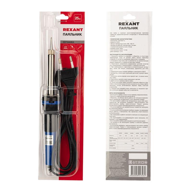 Паяльник с долговечным жалом мощностью 25Вт REXANT предназначен для ручного монтажа/демонтажа электронных компонентов и других мелких деталей. Подходит как для любительского, так и для профессионального использования. Долговечное жало паяльника состоит из медьсодержащего сердечника, покрытого слоем электролитически осажденного железа, отличающегося высокой стойкостью к коррозии. При соблюдении ряда предосторожностей жало способно работать длительное время без утраты эксплуатационных свойств, а в случае необходимости его можно легко и быстро заменить (сменное жало в комплект не входит). Нагреватель имеет керамическую трубку, которая повысит энергоэффективность прибора. Паяльник оснащен ударопрочной рукояткой из термостойкого пластика с резиновой накладкой, которая сделает работу с инструментом легкой и приятной.