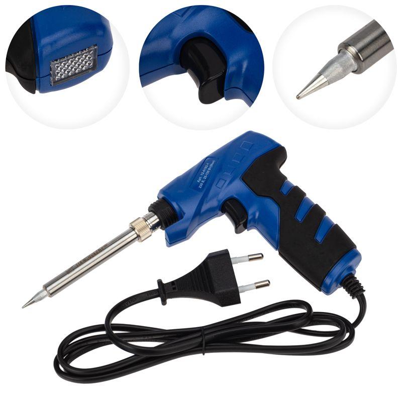 Паяльник-пистолет двухрежимный с керамическим нагревателем серии ПРОФИ мощностью 25/130Вт REXANT предназначен для ручного монтажа/демонтажа электронных компонентов и других мелких и средних деталей. Конструктивные особенности: рукоятка в форме пистолета, возможность осуществлять пайку в двух режимах мощности (25Вт и 130Вт). Наличие 2-х режимов обеспечит экономичное энергопотребление. Максимальная мощность и ускоренный разогрев активируются нажатием и удержанием кнопки, расположенной на рукоятке, что позволяет мастеру сначала установить жало инструмента в определенную точку пайки, а затем перевести паяльник в максимальный рабочий режим. Керамический нагреватель обеспечит быстрый прогрев жала и длительный срок службы паяльника. Долговечное жало паяльника состоит из медьсодержащего сердечника, покрытого слоем электролитически осажденного железа, отличающегося высокой стойкостью к коррозии. В случае необходимости жало можно легко и быстро заменить (сменное в комплект не входит). На корпусе расположен индикатор включения. Удобная эргономичная рукоятка изготовлена из термостойкого пластика и имеет резиновые вставки.