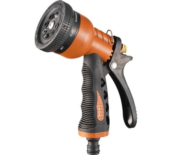 Пистолет-распылитель, 8 режимов полива эргономичная прорезиненная рукоятка, регулировка напора воды металлическая.