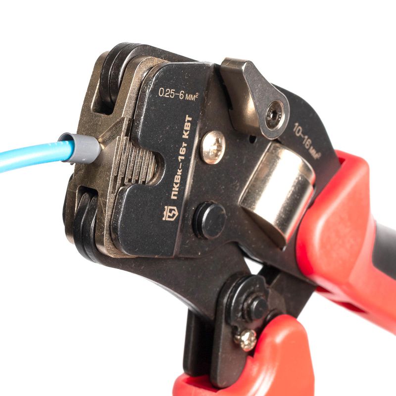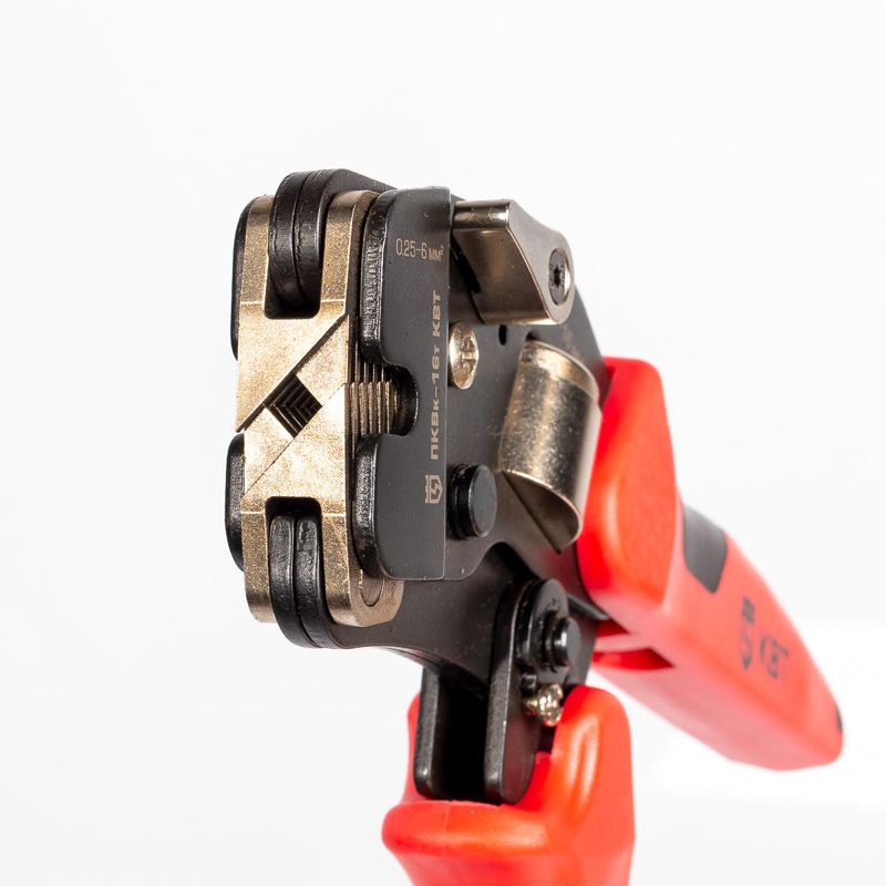 • Диапазон сечений втулочных наконечников: • НШВИ, НШВ: 0.25–16 мм2 • НШВИ(2): 2х0.5–2х10 мм2 • Уникальная модель с торцевой матрицей обжима • Инструмент рекомендован для монтажа коротких выходов проводов из распределительных коробок или электрических щитков, там, где использование аналогичных инструментов с боковой матрицей затруднено или невозможно • Универсальный инструмент для опрессовки практически всего ряда втулочных наконечников • Одна торцевая саморегулирующаяся матрица на все типоразмеры диапазона • Ширина обжимной матрицы: 16 мм • Инструмент перекрывает диапазон из 19 размеров втулочных наконечников • Переключатель прижимного усилия матрицы • Два положения переключателя диапазона сечений: • левое положение - опрессовка наконечников сечений 0.25–6.0 мм2 • правое положение - опрессовка наконечников сечений 10–16 мм2 • Квадратный профиль обжима с рифлением • Усовершенствованный храповой механизм, гарантирующий полный цикл опрессовки • Рычаг разблокировки храпового механизма • Двухкомпонентные эргономичные рукоятки со вставками из мягкой термопластрезины • Вес: 506 г • Длина: 200 мм