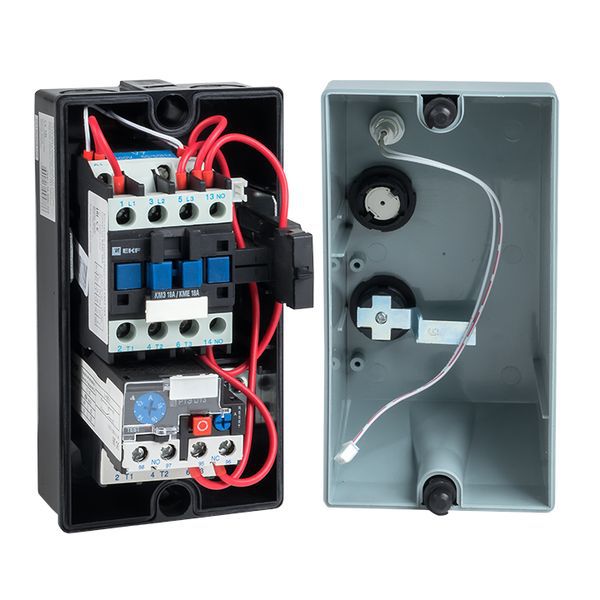 Пускатель магнитный КМЭ EKF PROxima является комплектным устройством, состоящим из малогабаритного контактора КМЭ, теплового реле РТЭ, оболочки с сальниками и кнопок управления. Пускатели предназначены для дистанционного пуска непосредственным подключением к сети и остановки трехфазных асинхронных электродвигателей с короткозамкнутым ротором на напряжение переменного тока до 400 В, а также для защиты электродвигателей от перегрузок недопустимой продолжительности и сверхтоков, возникающих при обрыве одной из фаз. При применении контакторов КМЭ 0910 – КМЭ 3210 используется пластиковый корпус, контакторов КМЭ 4011 – КМЭ 9511 – металлическая оболочка.