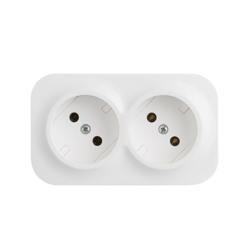 Розетка двухместная без заземления и защитных шторок QUTEO для открытого монтажа. Применяется в зданиях с проводкой без заземляющего контакта. Подходит для жилых комнат, офисов и других помещений со стандартными требованиями к электробезопасности. Надежные винтовые зажимы обеспечивают качественное соединение проводов, а компактные размеры и нейтральный дизайн делают эту розетку универсальным выбором для любого интерьера.