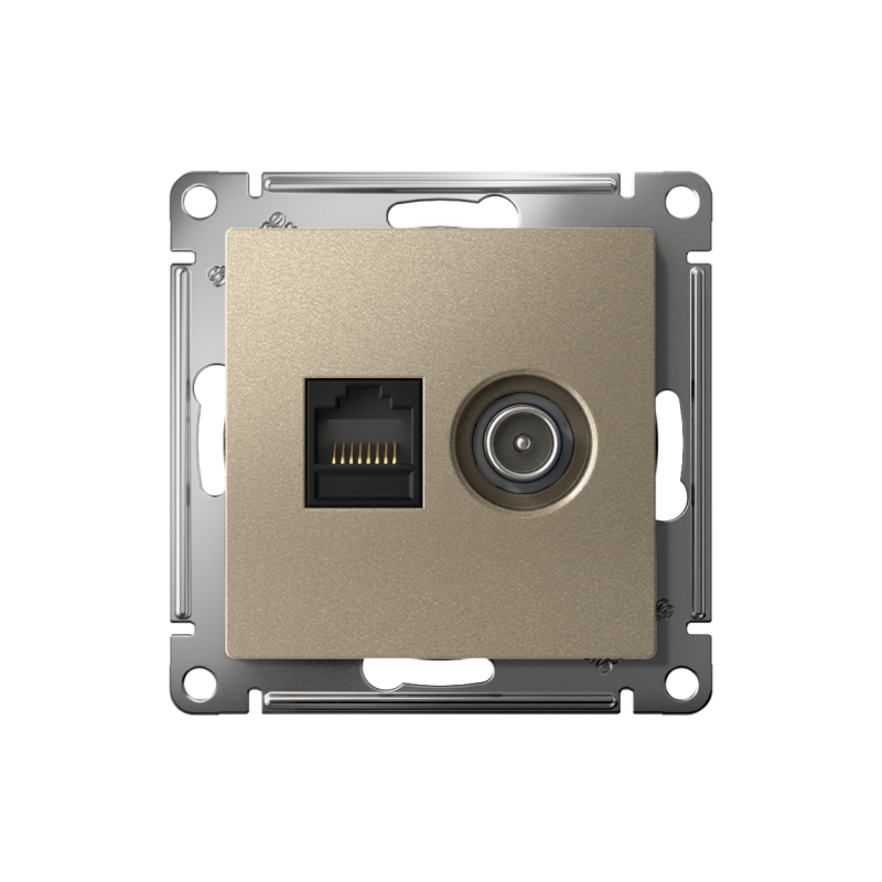Механизм Systeme Electric (ранее Schneider Electric) серии AtlasDesign в цвете шампань двойной розетки разъёмами RJ45 категории 5е и TV предназначен для удобного и быстрого подключения вашего компьютера и телевизора к соответствующим сетям. Лицевые детали из качественного ABS-пластика, устойчивого к царапинам и УФ-излучению. Усиленные прямые монтажные лапки для лучшей фиксации механизма в монтажной коробке.