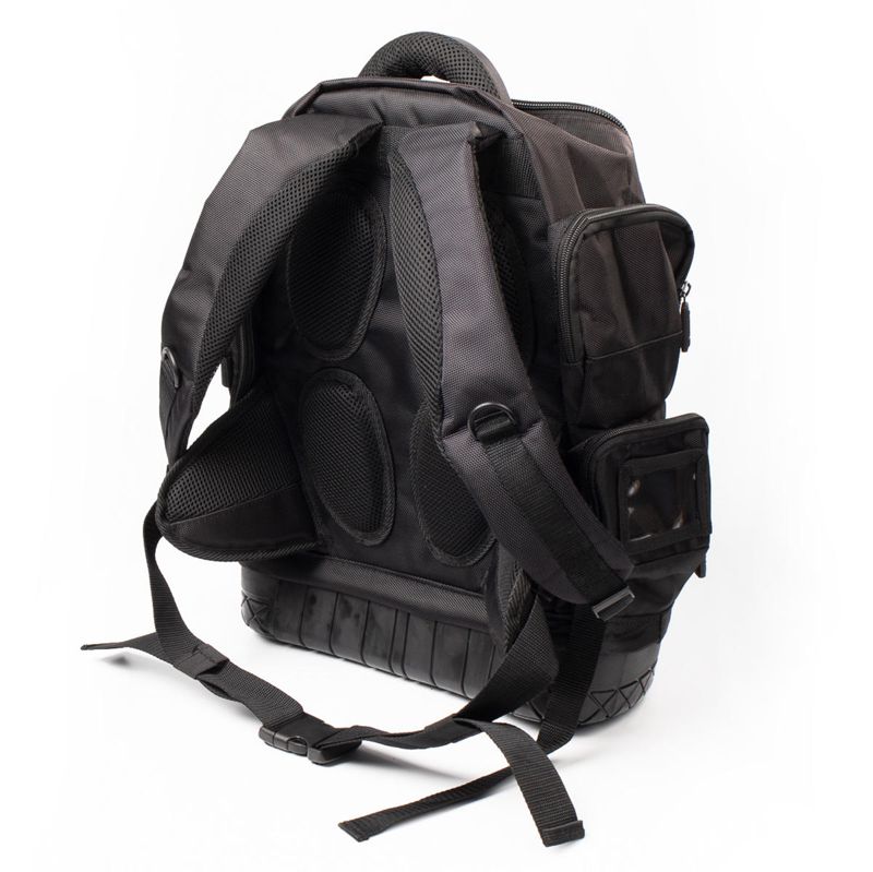 • Материал: влагозащитный полиэстер 1680D Оксфорд WR PVC (610 г/м2) • Лицевая часть ткани покрыта пропиткой WR (water resistence), изнаночная часть PVC (поливинилхлоридом), что обеспечивает водонепроницаемость и водоотталкивающие свойства • Конструкция: • просторное внутреннее отделение с 1 большим широким карманом и 16 карманами для инструментов • переднее отделение с 8 внутренними мини-карманами • 3 боковых кармана разных габаритов • 1 внешний фронтальный карман на липучке, 8 капроновых крепежных элементов на фронтальной и боковой частях рюкзака • широкий плоский карман на задней части рюкзака • 2 металлических крепежных кольца • Широкие мягкие регулирующиеся лямки • Мягкие анатомические вставки на спинке рюкзака • Светоотражающие элементы на клапане рюкзака • Прочные усиленные молнии с крупными звеньями • Водозащитное резиновое дно с высокими бортиками • Рюкзак выдерживает вес до 20 кг • Объем рюкзака: 22.4 л • Вес: 1.95 кг • Габариты (ВхДхГ, мм): 430*360*230