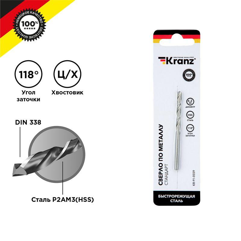 Сверло по металлу 4.2х75х43мм HSS DIN 338 Kranz KR-91-0559