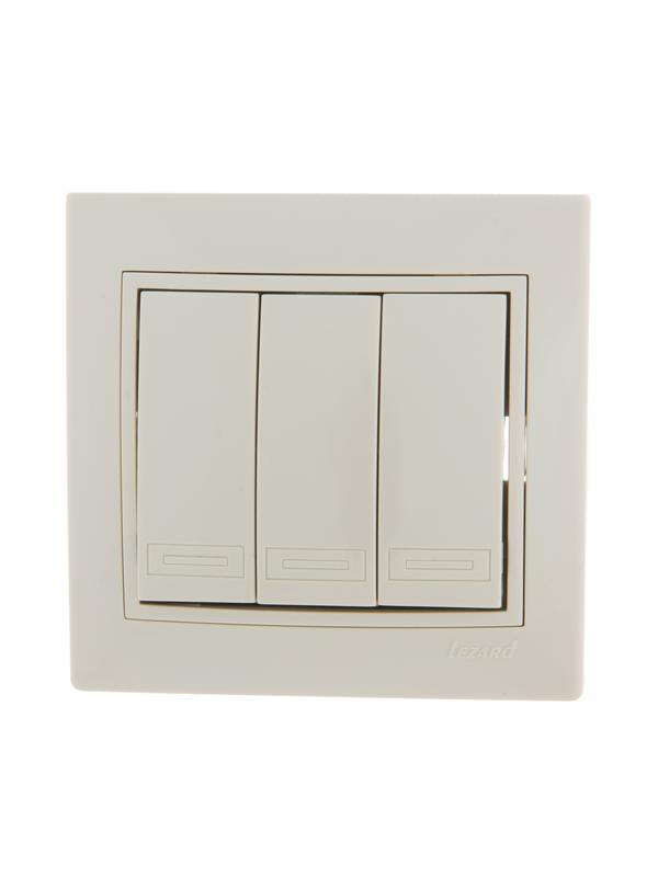 • НАЗНАЧЕНИЕ Выключатель 3-клавишный это двухпозиционный коммутационный аппарат с замыкающими (нормально-разомкнутыми) контактами, предназначенный для работы в сетях с напряжением до 1000 вольт, не предназначенный для отключения токов короткого замыкания, без специальных устройств дугогашения, местного управления, с ручным приводом. • ОБЛАСТЬ ПРИМЕНЕНИЯ В основном применяются для включения и выключения освещения в бытовых и производственных условиях. • ПРИНЦИП ДЕЙСТВИЯ Принцип действия основан на коммутации контактов механическим способом (нажатием) , при этом положения коммутации фиксированы и позволяют находится в этом режиме достаточно долго, вплоть до следующего воздействия. • ДОПОЛНИТЕЛЬНЫЕ ПРИНАДЛЕЖНОСТИ ИЛИ АКСЕССУАРЫ
